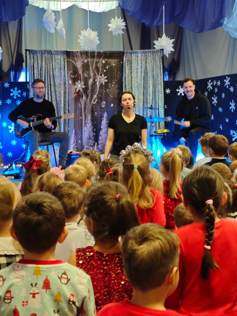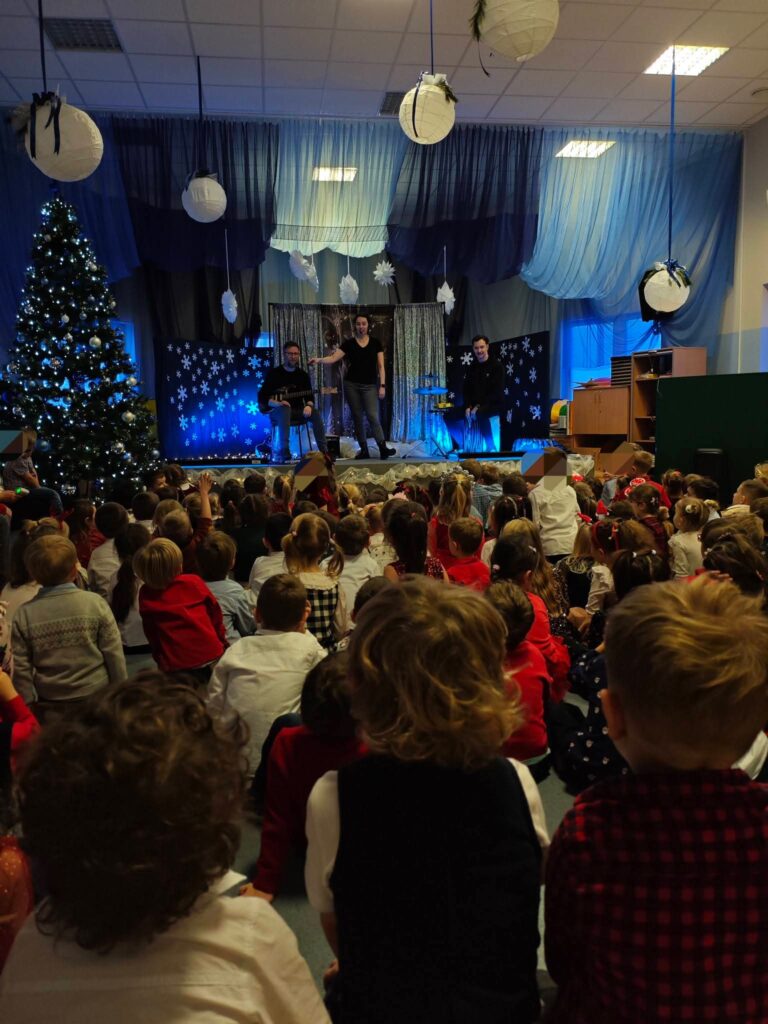 Jedną z nich było spotkanie z Klubem Małego Muzyka, który zabrał nas w niezwykłą podróż do zimowej krainy razem z Rytmem i Melodią. Dzieci miały okazję posłuchać brzmienia różnych instrumentów muzycznych, takich jak: kahon, dzwonki chromatyczne, tamburyn, janczary, gitara elektryczna oraz talerze. Wspólnie śpiewaliśmy piosenki świąteczne oraz kolędy, czerpiąc wiele radości ze wspólnego muzykowania.